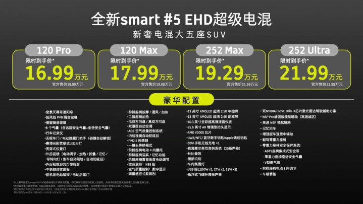 smart #5 EHD超级电混,共推出4个版型,全系标配120多项豪华配置:超级电混 120 Pro,入门即顶配,轻松应对城市日常;超级电混 120 Max,豪华进阶不焦虑,豪华插混品质之选;超级电混 252 Max,里程进阶新远方,长途旅行说走就走;超级电混 252 Ultra,豪华智能一步到位,体验更全面。新车以极致配置满足不同用户需求,诚意满满。